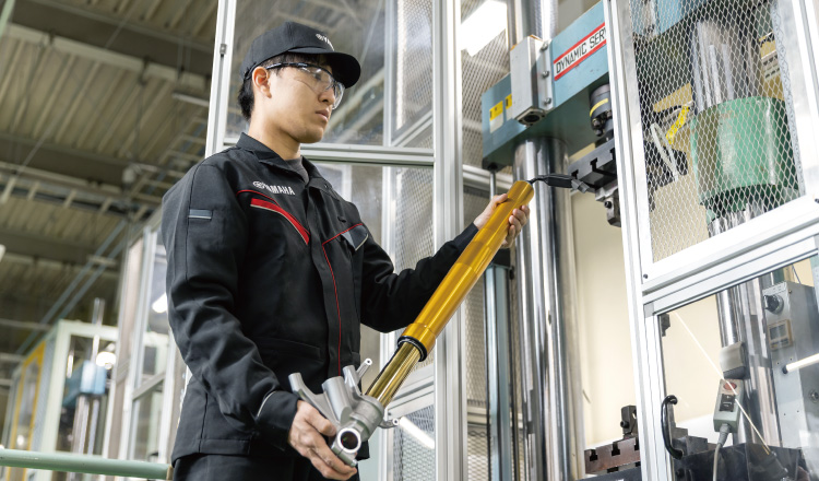 開発部 開発1グループの実験担当として、パワーチルト&トリム(PTT)の各種評価試験を行っています。配属直後は、代表的なPTTを分解して構造や作動原理を理解するところからスタート。入社2年目となる現在は、「課題評価一覧」に基づき、試作品の性能評価を担当しています。油圧バルブの衝撃吸収性能、作動耐久性、低温環境での作動確認などを、自社のPTT試験機を用いて実施。グリース変更に伴う環境・耐久試験や、2024年に新しくヤマハグループとなったドイツのTorqeedo (トルキード)社向けPTTの性能確認など、新しいテーマにも取り組んできました。これらの試験結果はデータや写真、分解調査の内容などに整理し、設計へ報告書としてフィードバックしています。